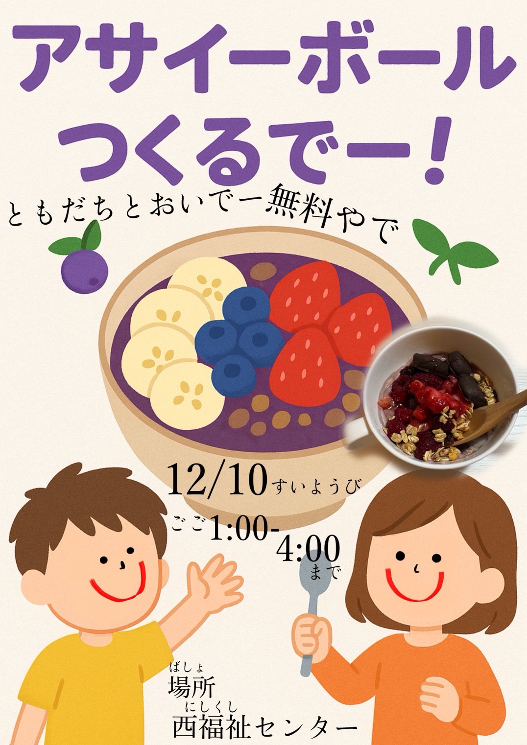 【12/10(水)PM】アサイーボウルをつくろう! 開催履歴 2025.12.052025.12.17 美味しくて身体に良いスイーツ『アサイーボウル』。フルーツやチョコでデコレーションしてオリジナルのアサイーボウルを作ろう! 企画・運営 NPO法人市民活動サークルえん ◆実施時間 13:00~16:00 ※申込不要 対 象 高校生以下(保護者もぜひご一緒にどうぞ) 参加費 無料
